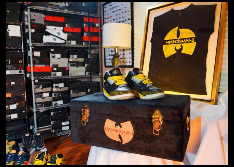 The size-11 Jordan III sneakers, autographed by 12 of the most prominent Wu-Tang Clan members (RZA, GZA, Ghostface Killah, Raekwon, Method Man, Inspectah Deck, Masta Killa, U-God, Ol’ Dirty Bastard by Young Dirty Bastard, Cappadonna, Mathematics, and Killah Priest), are provided by Matthew Markoff (President of Holy Toledo Productions, LLC.)